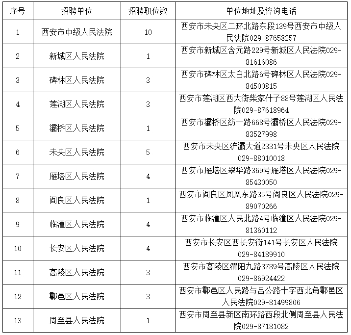 全市法院共招聘聘用制書記員43名,各法院招聘職位、地址及政策咨詢電話詳見《西安法院2023年面向社會(huì)公開招聘聘用制書記員職位表》(附件)。