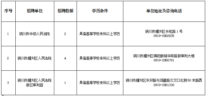 (七)有關(guān)招聘信息將在“銅川市中級人民法院 ”官網(wǎng)及微信公眾號上公布,請考生密切留意并及時查看,如因考生未及時查看等原因,導致的相應后果由本人承擔。