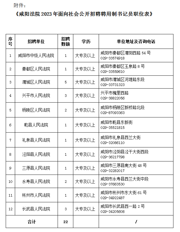 全市法院共招聘聘用制書記員22名,各法院招聘職位、地址及政策咨詢電話詳見《咸陽法院2023年面向社會公開招聘聘用制書記員職位表》(附件)。